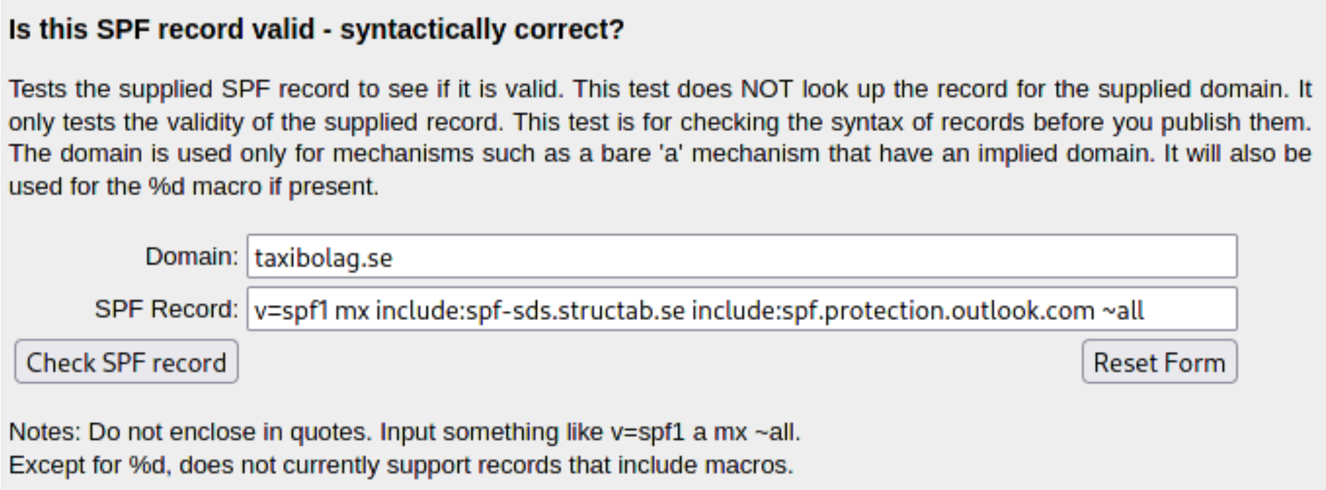 För att garantera leverans av e-post när SDS e-postserver används, så måste ni ha en lista över godkända epostservrar för er domän. Mest använda standarden för detta är Sender Policy Framework, SPF.