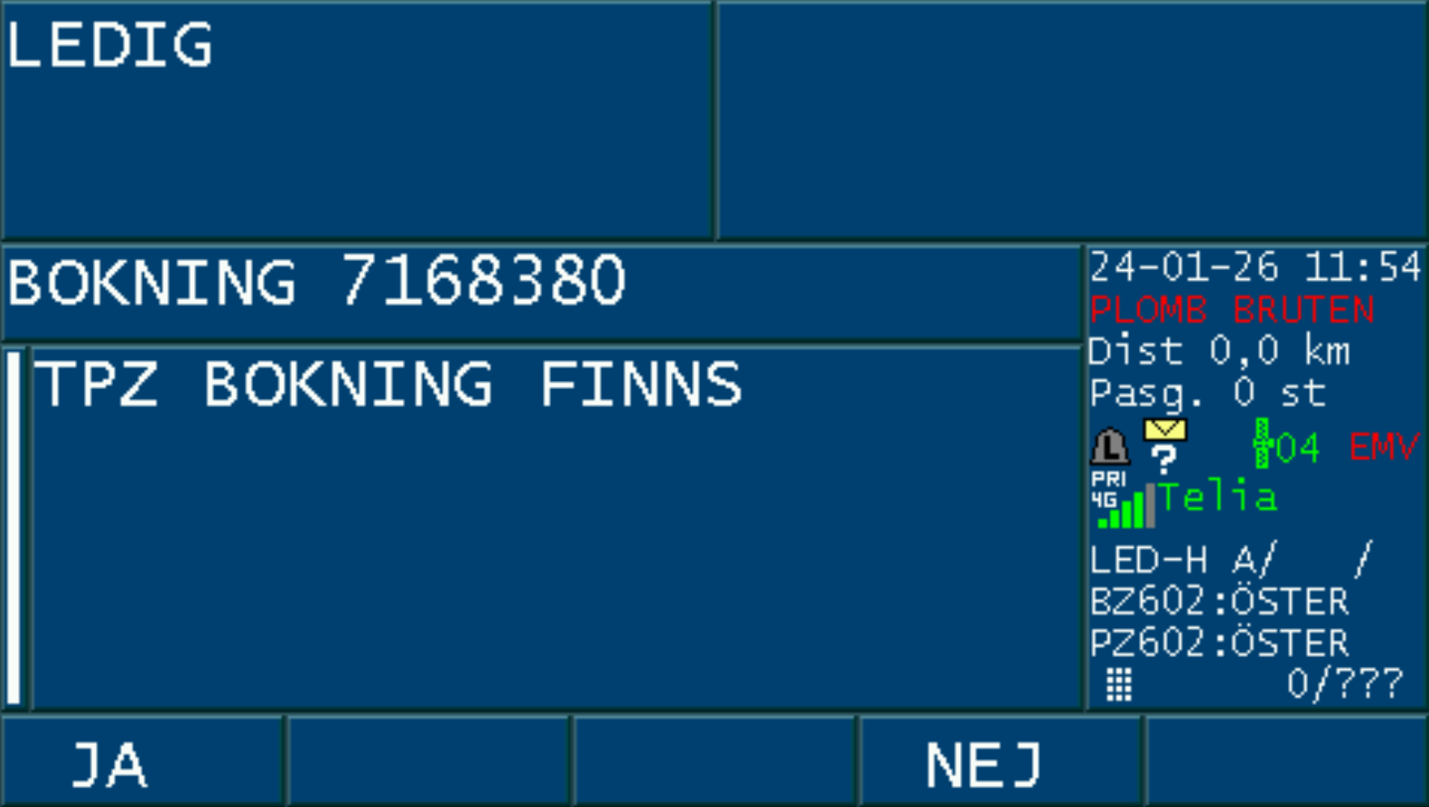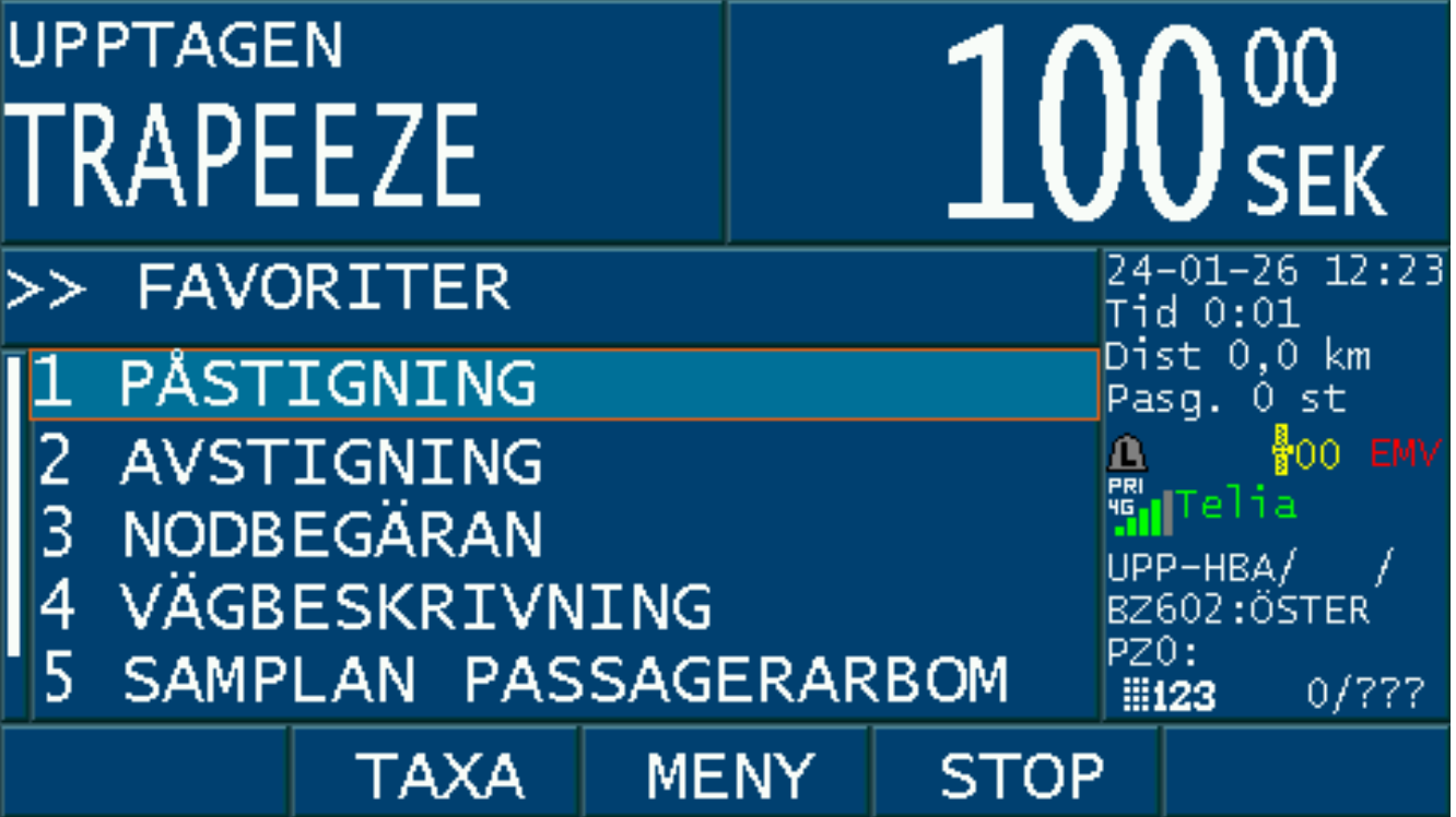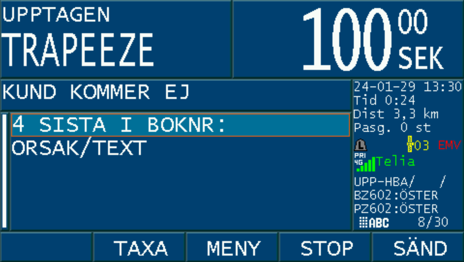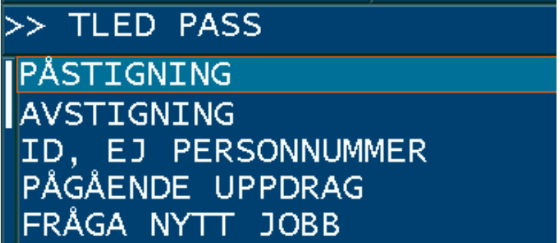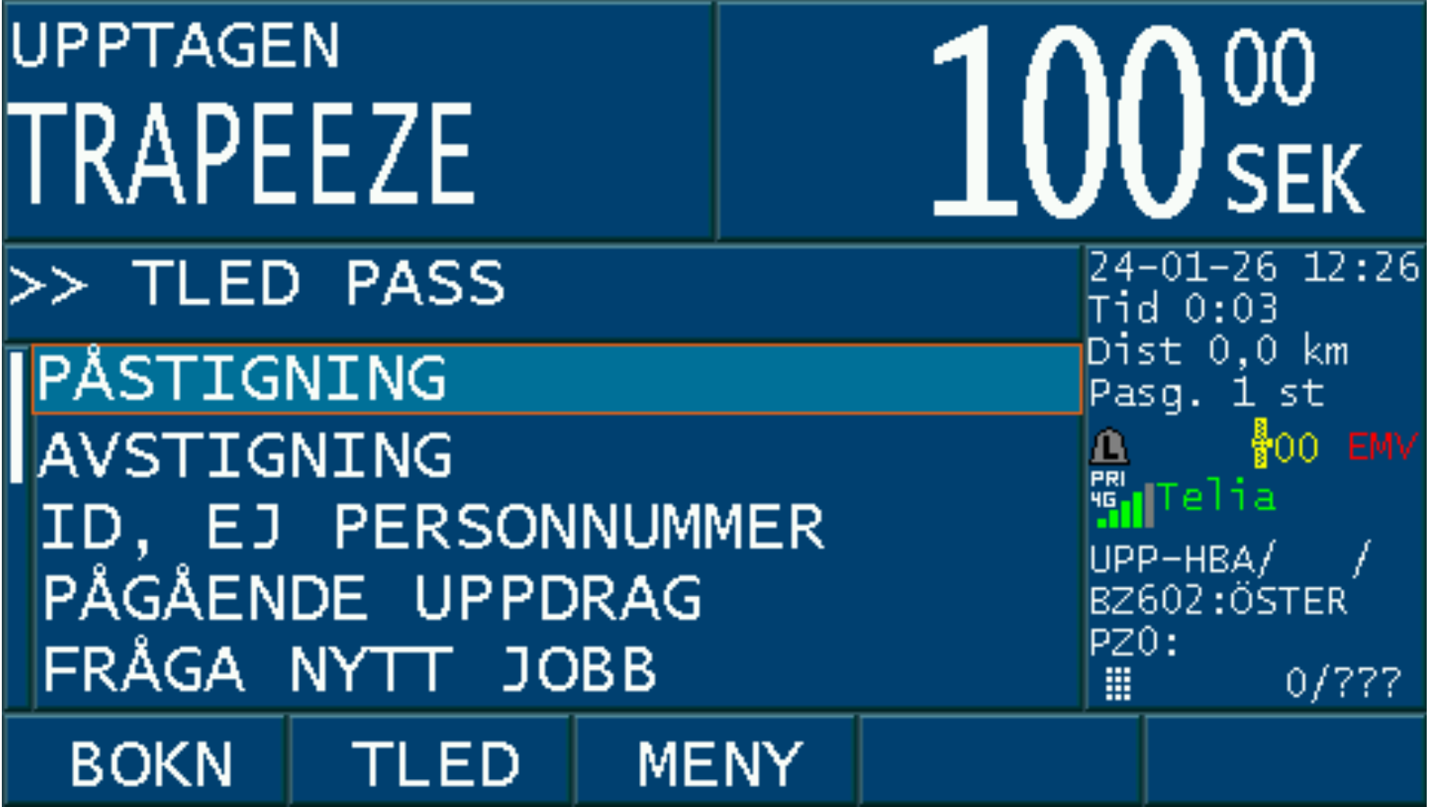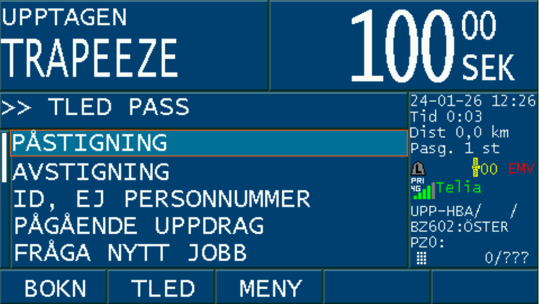 Då bokningen är accepterad med ”JA” och taxa väljs på bokningen, aktiveras PASS-läget i taxametern.