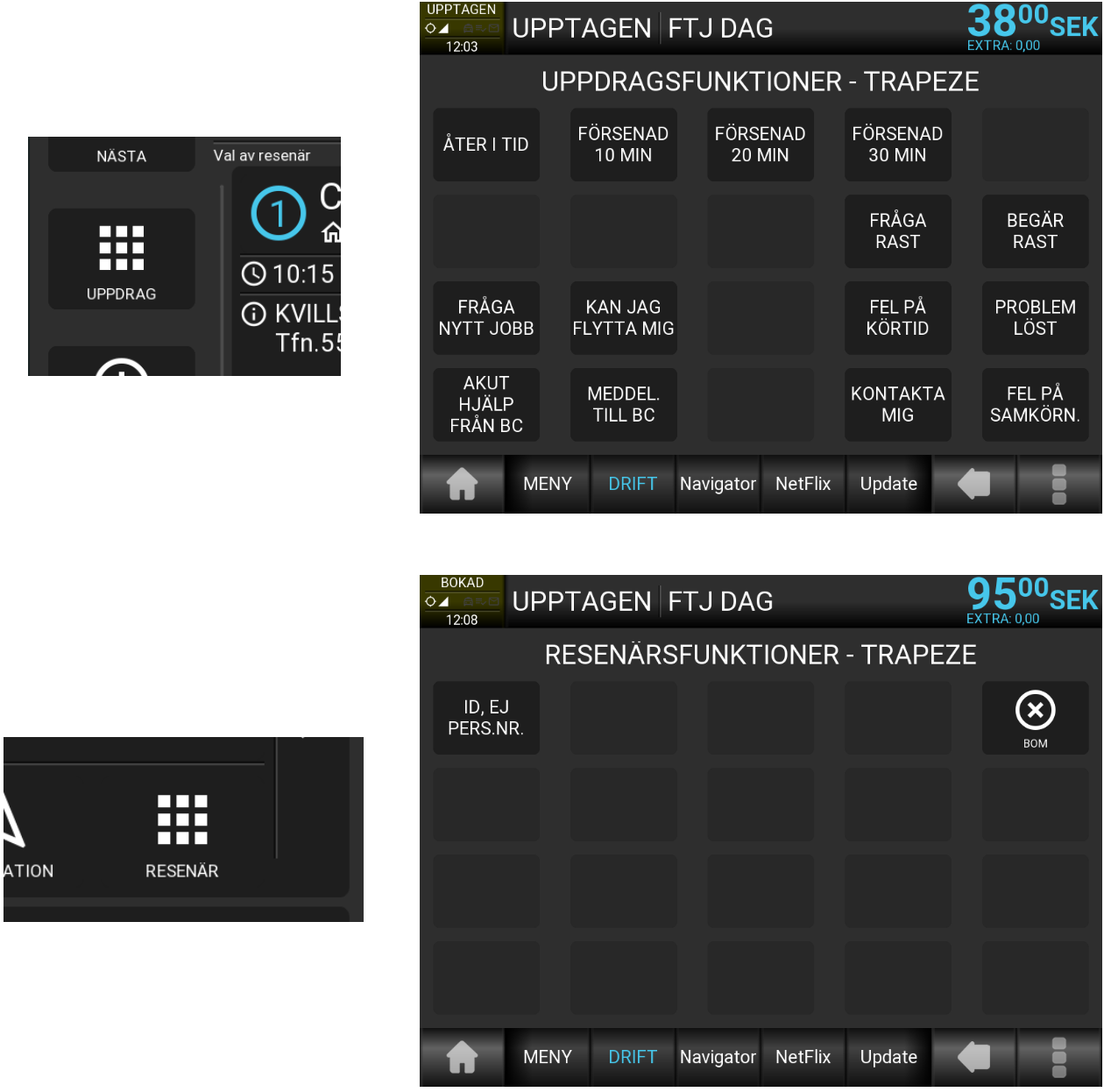 Innehåller funktionerna: Försenad 10 Försenad 20 Försenad 30 Åter i tid BOM (Begär resenärens sista fyra siffror i Trapeze/Alfas/voyagerrs bokningsnummer samt en orsak) |