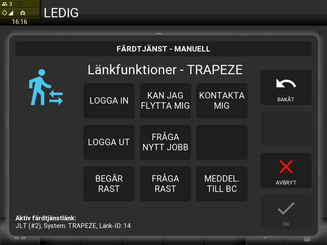 Innehåller funktionerna: Försenad 10 Försenad 20 Försenad 30 Åter i tid BOM (Begär resenärens sista fyra siffror i Trapeze/Alfas/voyagerrs bokningsnummer samt en orsak) |