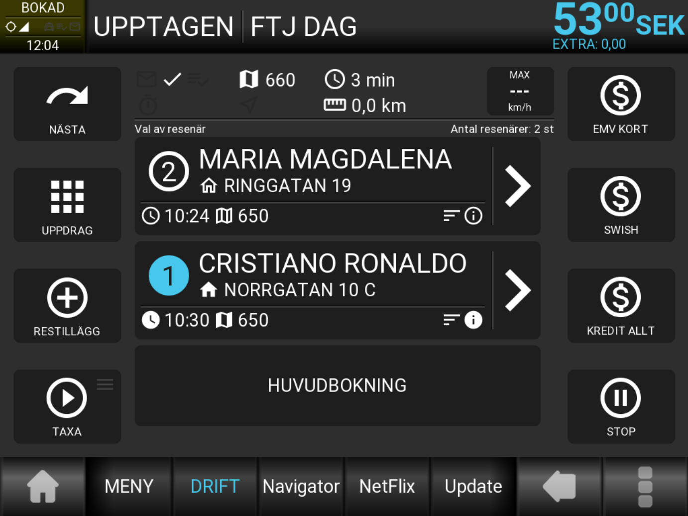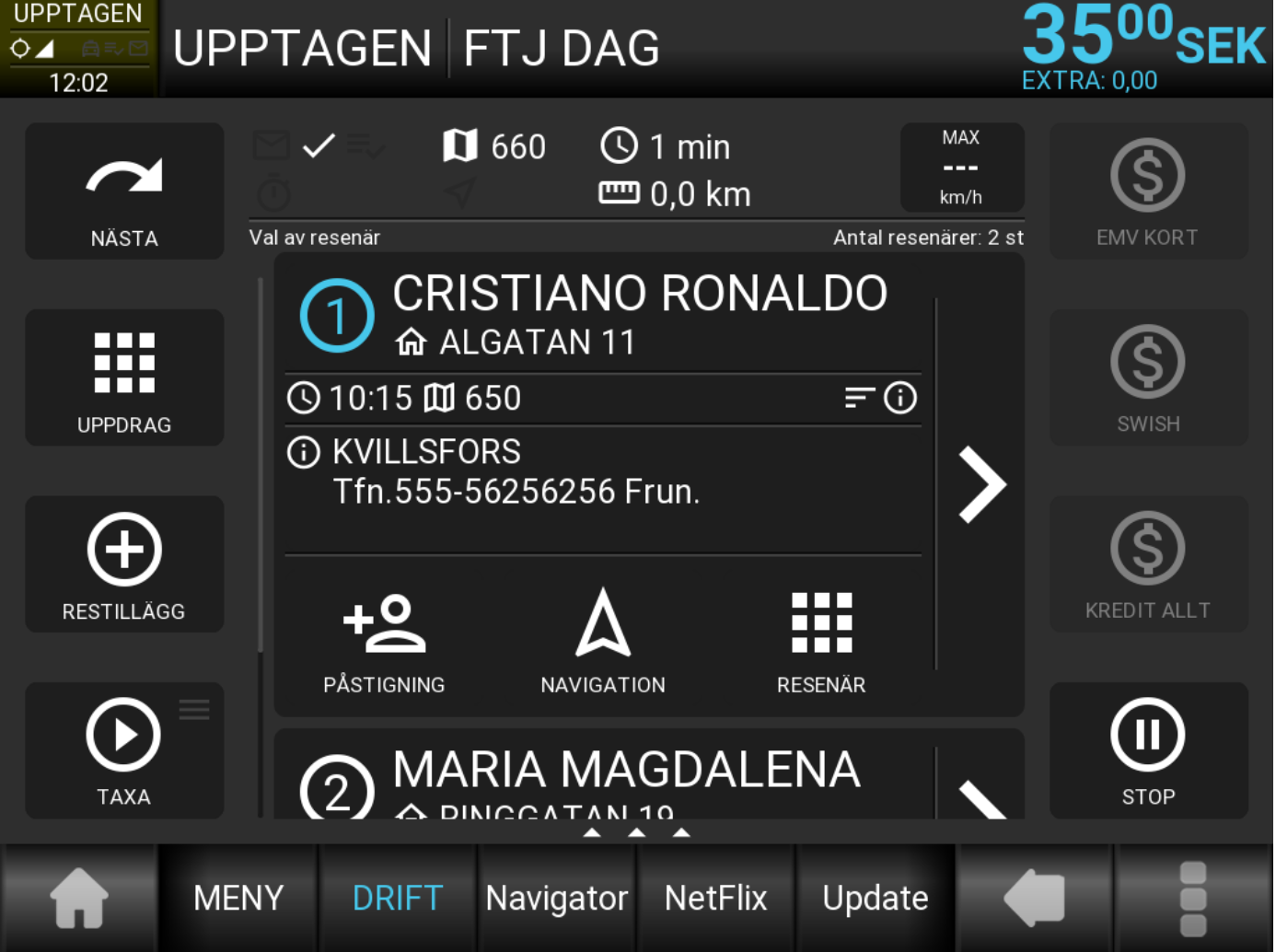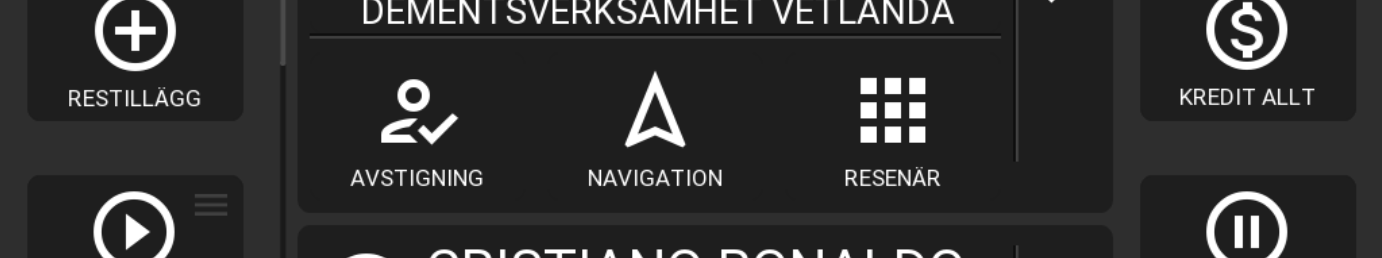 Efter att påstigning har utförts, visas lämna- informationen. Observera att detta marke- ras med ifyllda ikoner. Om då taxametern är inställd så att resenärerna omsorteras efter nästa hämta eller lämnatid, kommer nästa hämtning eller lämning alltid att ligga högst upp i listan.