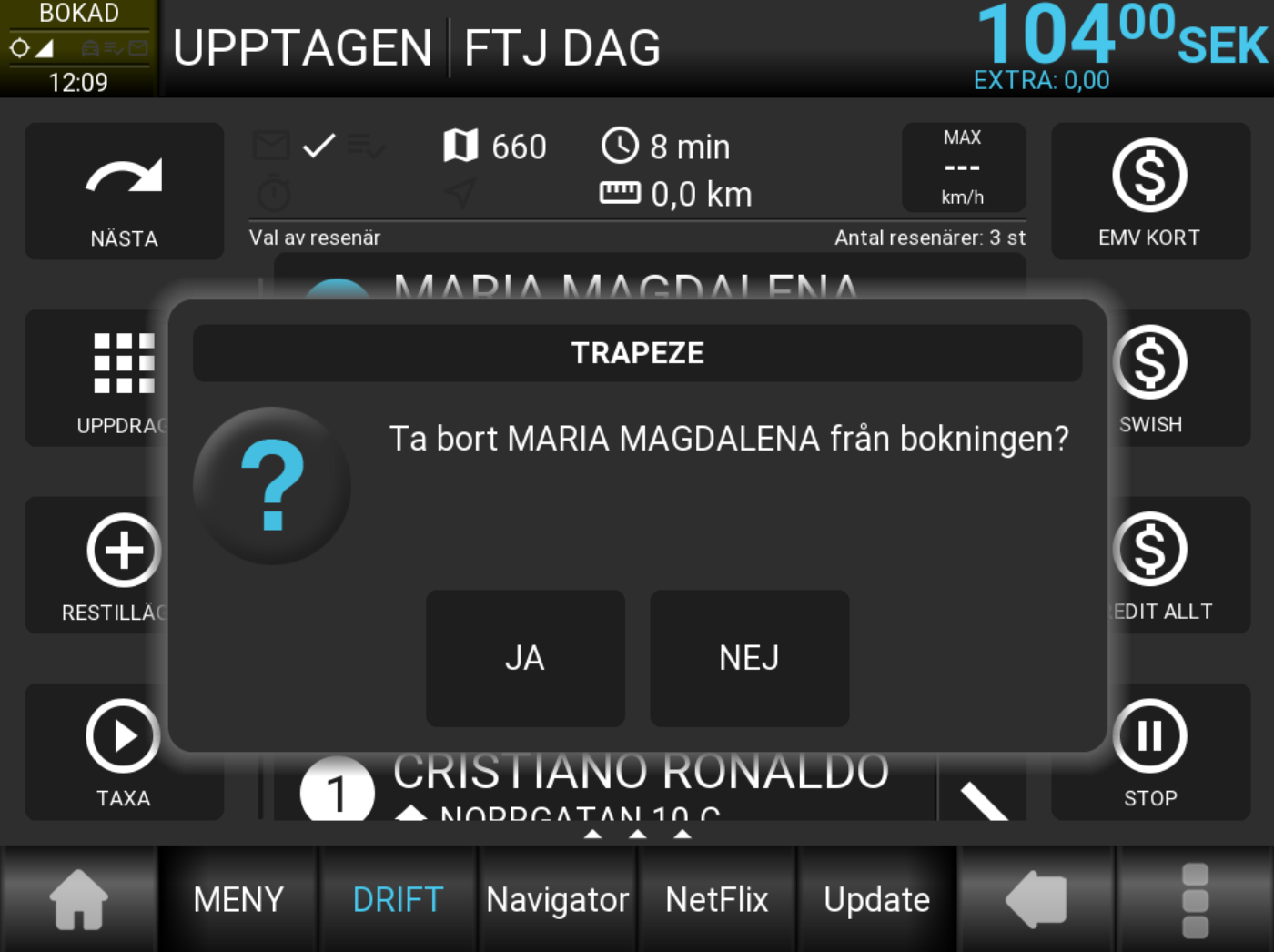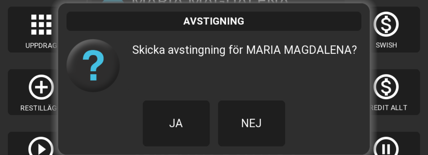 När avstigning är skickad kan taxametern vara inställd på att fråga om resenären ska tas bort från listan. Då alla resenärer har hanterats på något sätt kan man gå till slutbetalning. Driftläget återställs då till normalt utseende.