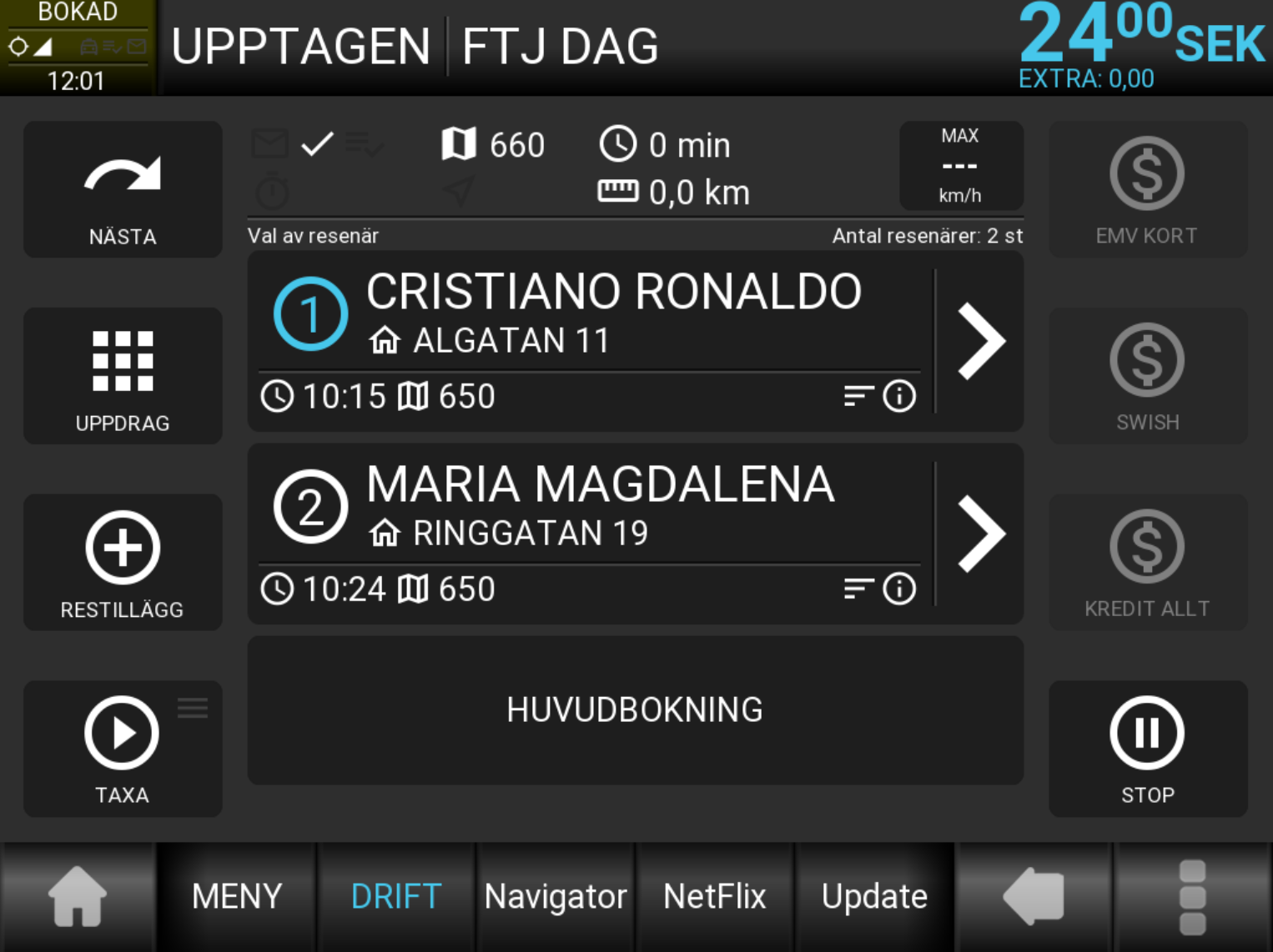 Resenärer stiger av och tas bort från listan då betalning på resenären utförs.